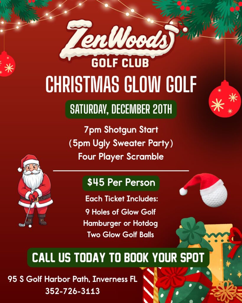 Kick off the holiday season at ZenWoods with our Christmas Glow Golf event. Join us Saturday, December 20th for a festive night under the lights with a 7pm shotgun start and an optional ugly sweater party at 5pm. This four-player scramble is the perfect way to celebrate with friends. Tickets are $45 and include nine glow-in-the-dark holes, a hamburger or hotdog, and two glow balls. Space is limited, so invite your group and secure your spot today.