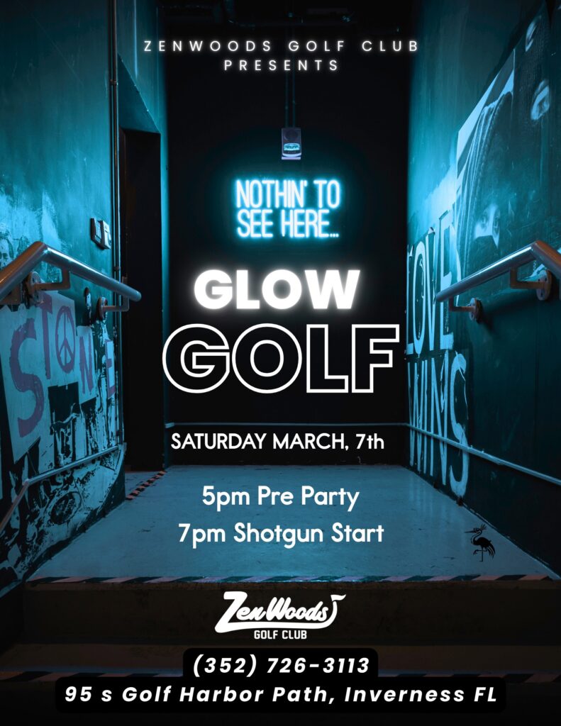 Glow Golf is back at ZenWoods Golf Club. Black lights, glowing greens, music, food, and a four-player scramble under the lights.