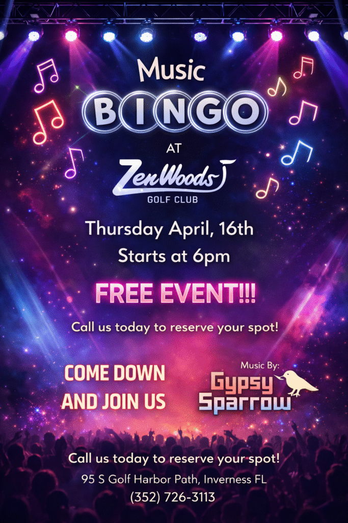 Music Bingo is back at ZenWoods Golf Club on Thursday, April 16th at 6PM and it’s completely FREE. Gypsy Sparrow is bringing the hits, you just have to recognize them.
