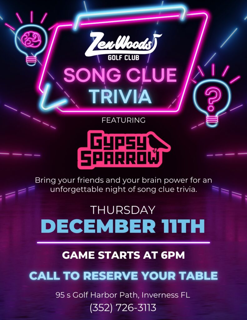 Light up your Thursday night at ZenWoods Golf Club with Song Clue Trivia featuring Gypsy Sparrow!