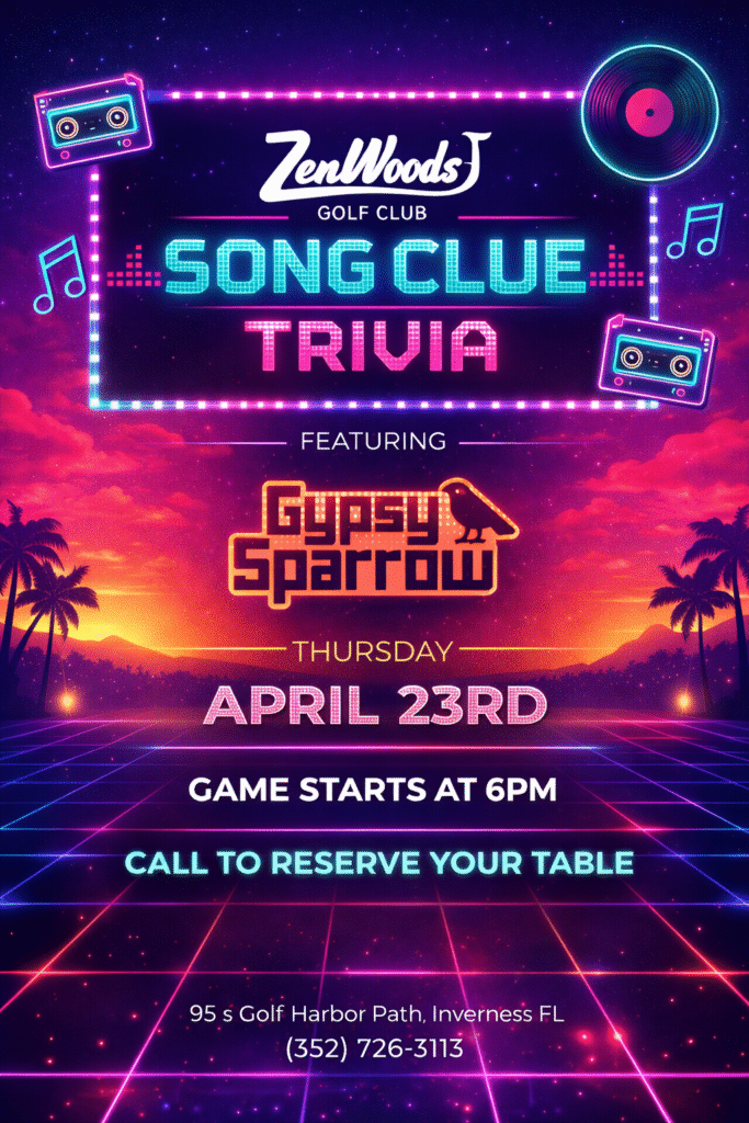 Song Clue Trivia hits ZenWoods Golf Club on Thursday, April 23rd at 6PM featuring Gypsy Sparrow bringing the soundtrack. We give you the clues. You name the song. The faster you answer, the better your odds.