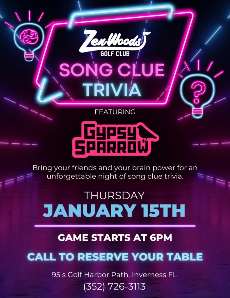 Light up your Thursday night at ZenWoods Golf Club with Song Clue Trivia featuring Gypsy Sparrow!