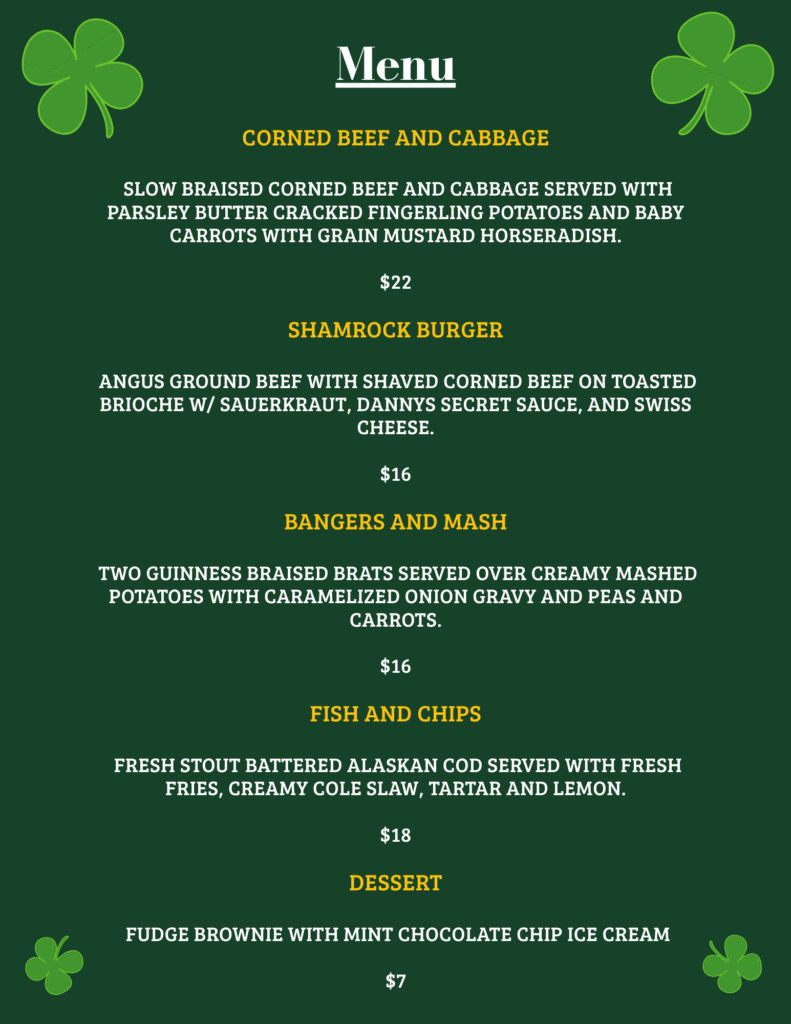 Corned Beef and Cabbage. Shamrock Burgers. Bangers and Mash. Fish and Chips. Mint chocolate chip brownies.