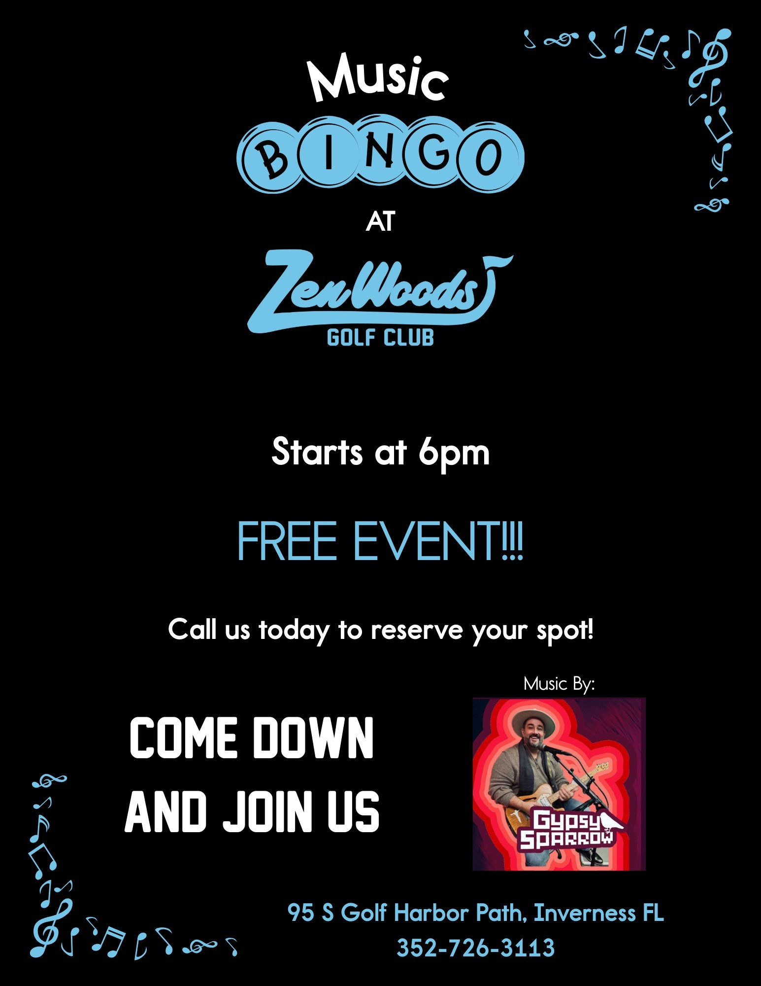 Join us for an unforgettable night of Music Bingo at ZenWoods Golf Club! On Thursday, January 8th at 6pm, we’re bringing the energy, the music, and the fun—with a FREE